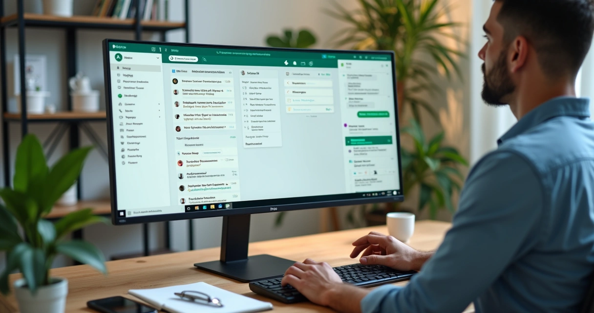 Profissional gerenciando atendimento personalizado em múltimas conversas de WhatsApp em um painel organizado