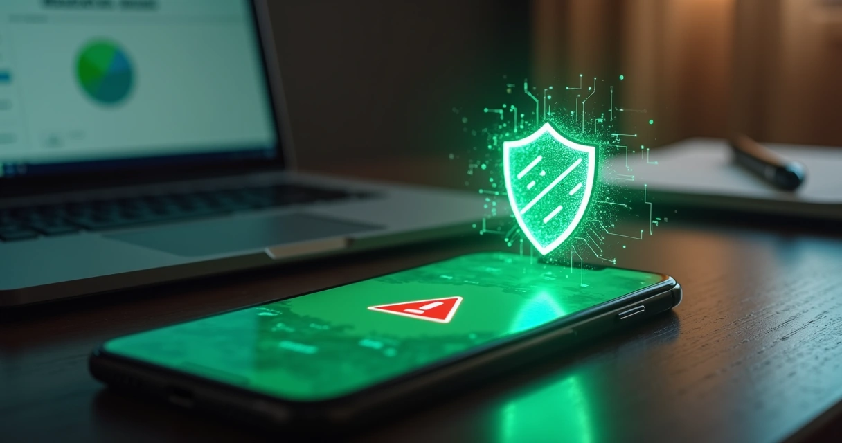 Tela de celular com alerta de bloqueio do WhatsApp ao lado de escudo de proteção digital