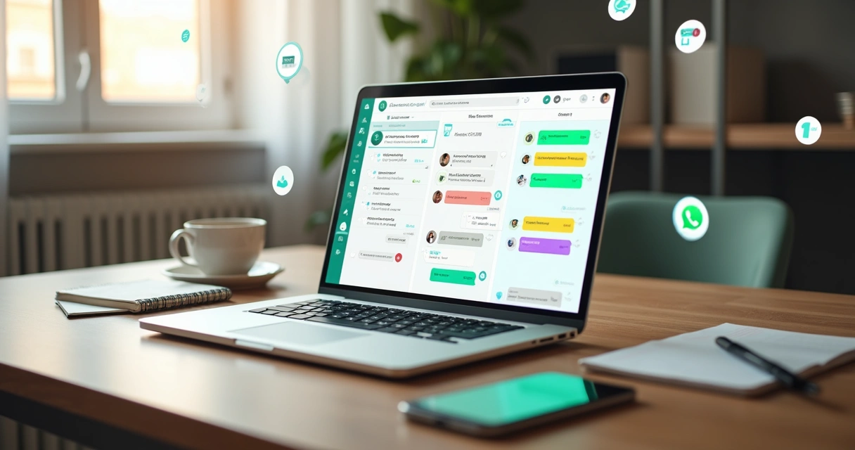 Tela de CRM integrada ao WhatsApp com funil de vendas visual em um notebook sobre mesa de escritório